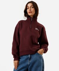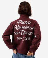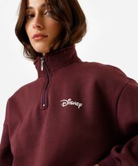 Blusão feminino confeccionado em moletom com estampa escrito "proud member of the Disney fan club" na parte posterior. A peça tem a modelagem e construção reta e o caimento é confortavelmente solto ao corpo. O modelo tem gola alta, fechamento por zíper e mangas longas. Detalhe de acabamento em malha canelada nos punhos e na barra.