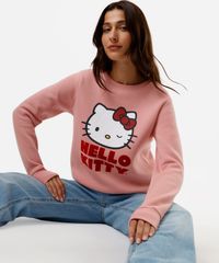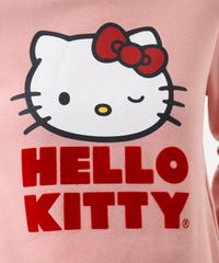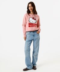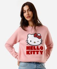 Blusão feminino confeccionado em moletom com estampa temática da Hello Kitty na parte frontal. A peça tem a modelagem e construção reta e o caimento é confortavelmente solto ao corpo. O modelo tem gola redonda e mangas longas. Detalhe de acabamento em malha canelada nos punhos e na barra.