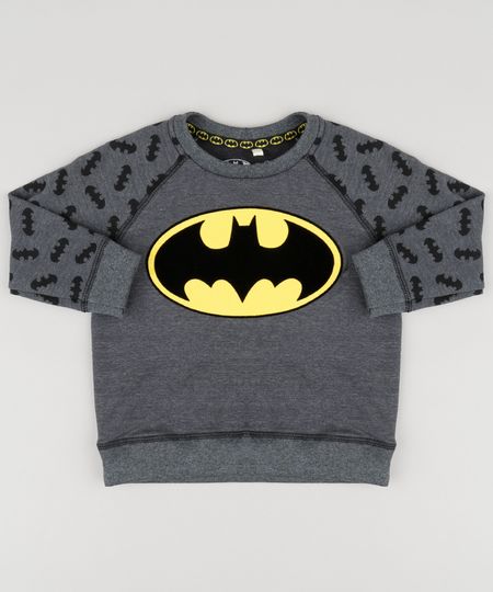 Blusão infantil masculino desenvolvido em moletom. Tem estampa frontal com logo do personagem Batman, da DC Comics, com acabamento flocado. As mangas são longas estampadas na modelagem raglan. A gola é careca. O acabamento da peça é em ribana.