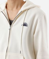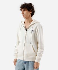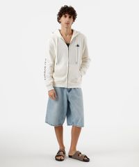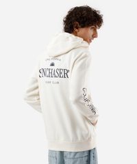 Blusão masculino confeccionado em moletom com estampa localizada escrito "sunchasers" na parte posterior. A peça tem a modelagem e construção reta e o caimento é solto ao corpo. O modelo tem capuz fixo forrado com cordão, fechamento por zíper e mangas longas. Possui dois bolsos e acabamento canelado nos punhos e na barra.