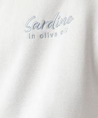 Blusão masculino confeccionado em moletom com bordados e estampa temática de sardinhas. A peça tem a modelagem e construção reta, caimento solto ao corpo e comprimento cropped. O modelo tem gola careca e mangas longas com botão nos punhos. Detalhe de acabamento em malha canelada nos punhos, gola e na barra.