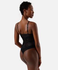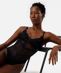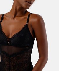 Body feminino confeccionado em tule e renda com padronagem em poá. O modelo possui caimento ajustado, decote v, sem bojos e com aros para melhor sustentação e detalhe de argolas aplicadas. Possui alças finas ajustáveis, transparência e fechamento inferior por botões de pressão. Composição 90% poliamida 10% elastano Modelo veste: P/38 Medidas da modelo: Altura: 1,80m Busto 79cm Cintura: 60cm Quadril: 89cm Instruções de lavagem: - Lavagem manual - Não alvejar - Não secar em secadora - Secar na vertical - Não passar - Não lavar à seco