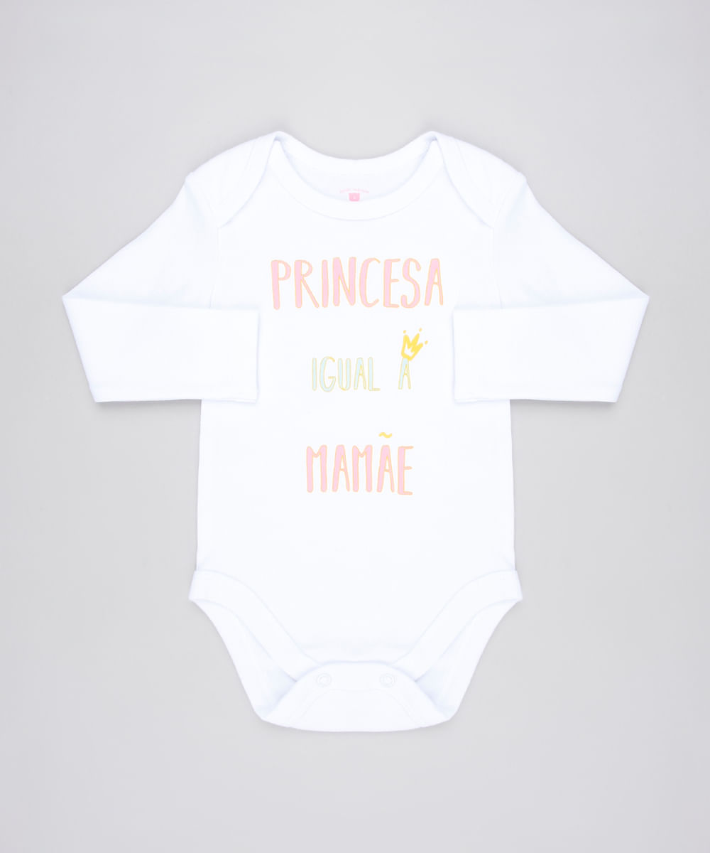 Body infantil feminino confeccionado em malha macia de algodão. A parte frontal tem estampa com a frase "Princesa igual a mamãe". As mangas são longas e o decote é redondo com sobreposição nas laterais para vestir com facilidade. Tem fechamento entrepernas por botões de pressão.