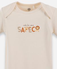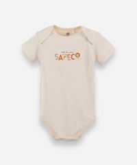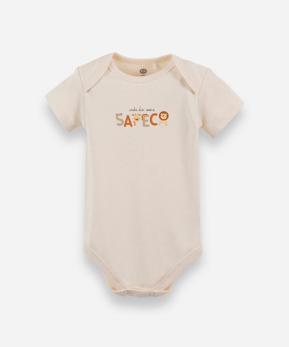 Body infantil confeccionado em malha macia de algodão com toque macio. A peça tem modelagem reta e caimento levemente solto ao corpo. O modelo tem gola redonda com aberturas laterais nos ombros, mangas curtas e detalhe frontal com estampa "cada dia mais sapeca". Possui fechamento por botões de pressão no entrepernas e acabamento pespontado.