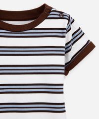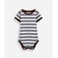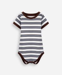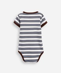 Body infantil confeccionado em malha macia de algodão com estampa listrada. A peça tem modelagem reta e caimento levemente solto ao corpo. O modelo tem gola redonda com abertura por botão e mangas curtas. Possui fechamento por botões de pressão no entrepernas e acabamento em viés contrastante.