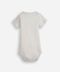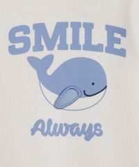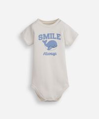 Body infantil confeccionado em malha de algodão com estampa localizada de baleia e a frase "smile always" A peça tem modelagem reta e caimento confortavelmente ajustado ao corpo. O modelo tem gola redonda, abertura por botões nos ombros e mangas curtas. O fechamento é por botões pressão no entrepernas.