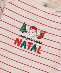Body infantil confeccionado em malha de algodão com estampa localizada escrito "meu primeiro natal" e listras. A peça tem modelagem reta e caimento confortavelmente ajustado ao corpo. O modelo tem decote redondo e mangas curtas. O fechamento é por botões pressão no entrepernas.