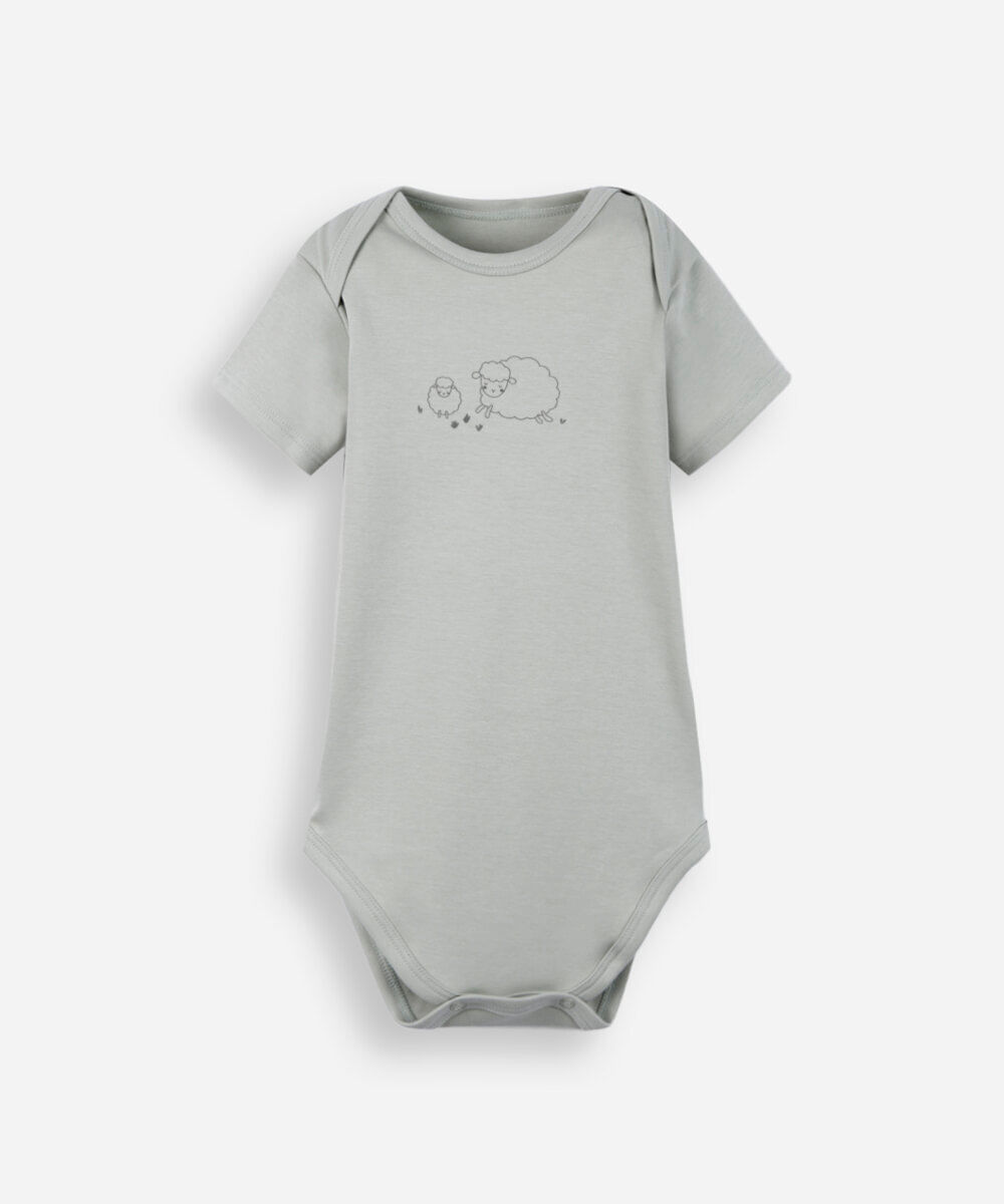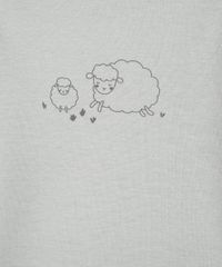 Body infantil confeccionado em malha de algodão peruano com estampa de ovelhas. A peça tem modelagem reta e caimento confortavelmente ajustado ao corpo. O modelo tem gola redonda e mangas curtas. O fechamento é por botões pressão no entrepernas.