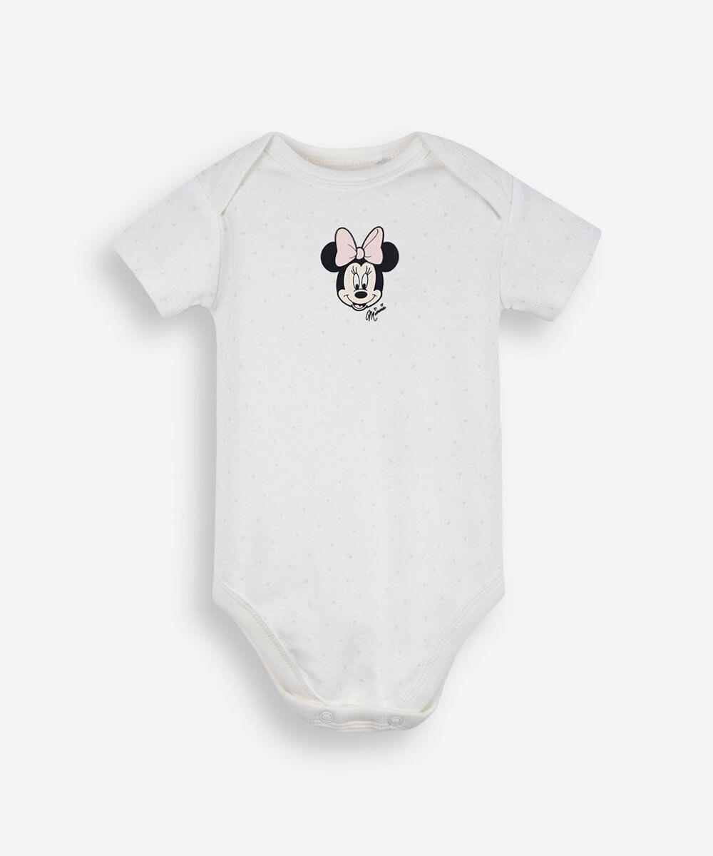 Body infantil confeccionado em malha de algodão com poá e da Minnie Mouse. A peça tem modelagem reta e caimento confortavelmente ajustado ao corpo. O modelo tem gola redonda e mangas curtas. O fechamento é por botões pressão no entrepernas.