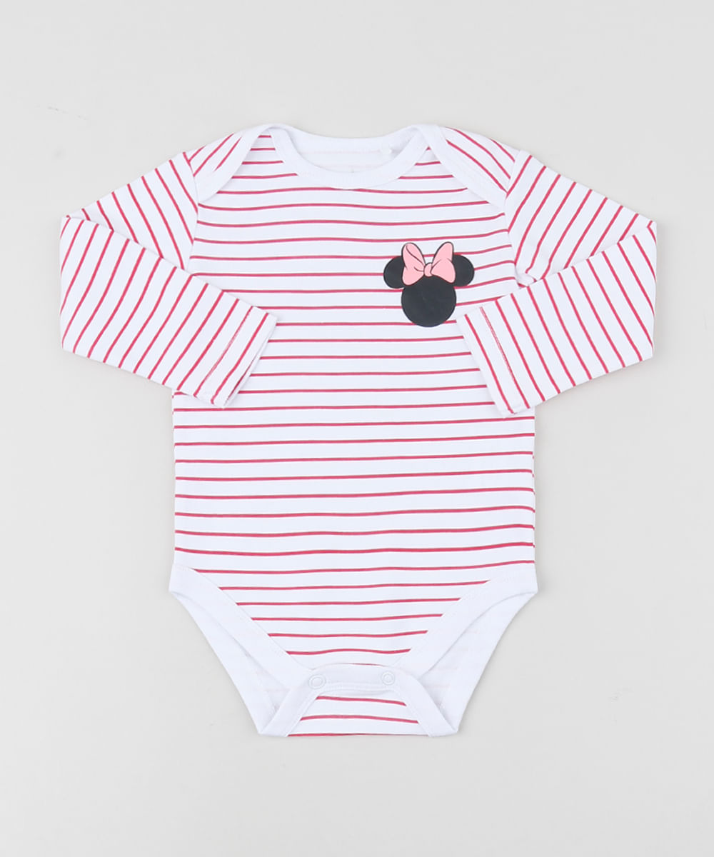 Body infantil desenvolvido em malha. Tem estampa listrada e da personagem Minnie, da Disney. A gola é careca e as mangas são longas.