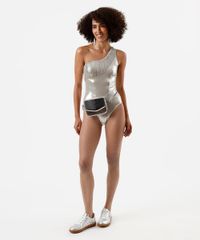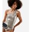 Body feminino confeccionado em malha com efeito metalizado. A peça tem modelagem reta e caimento confortavelmente ajustado ao corpo. O modelo tem decote diagonal com franjas de brilhos aplicados e alças larga. Possui forro em malha de algodão na base.