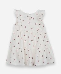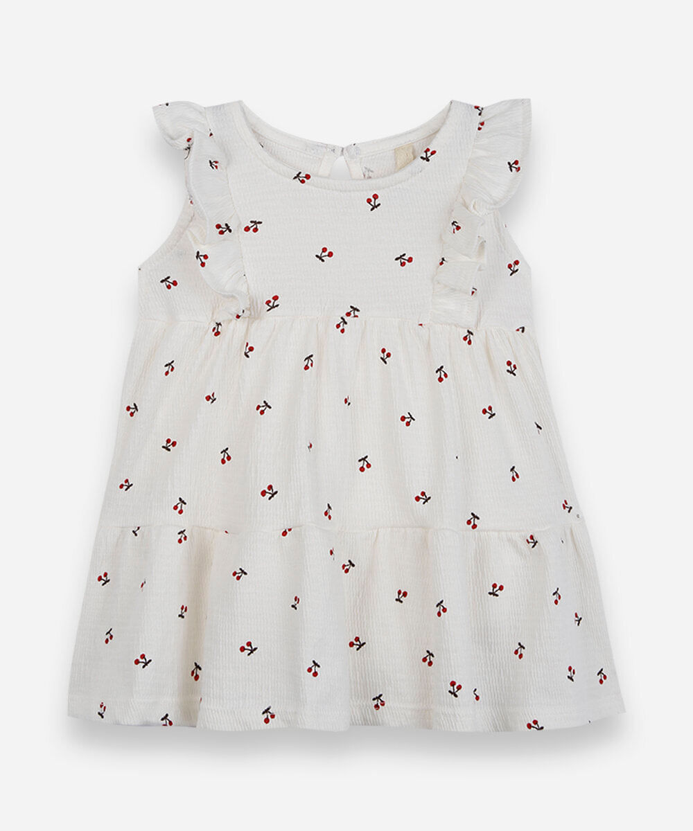 Vestido infantil confeccionado em malha texturizada de algodão com estampa de cerejas. A peça tem modelagem evasê, caimento solto ao corpo com recorte formando franzidos. O modelo tem decote redondo, abertura posterior por botão e alças largas com babados aplicados. Possui fechamento por botões de pressão no entrepernas e acabamento pespontado na barra.