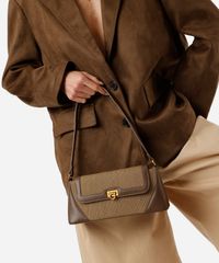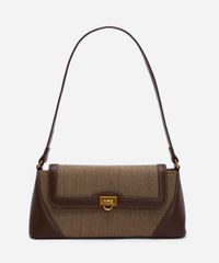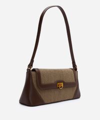 Bolsa baguete desenvolvida em material sintético resistente e tecido texturizado. O modelo tem formato retangular, com recortes pespontados, tampa com fecho giratório e alça fixa de ombro. Possui forro em tecido plano.