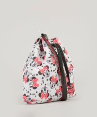 Bolsa desenvolvida em material encorpado. O modelo se destaca pela estampa de estrelas com a Minnie. Tem uma alça transversal e fechamento por botão. Acompanha 2 elásticos de cabelo.