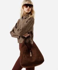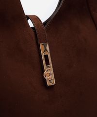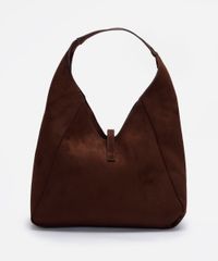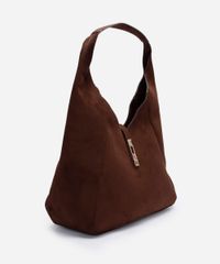 Bolsa hobo desenvolvida em material sintético resistente com textura de camurça. O modelo tem formato meia lua, com alça fixa de ombro, forro em tecido plano, bolso interno e fecho giratório.