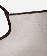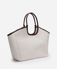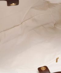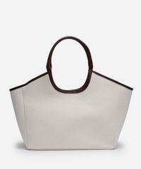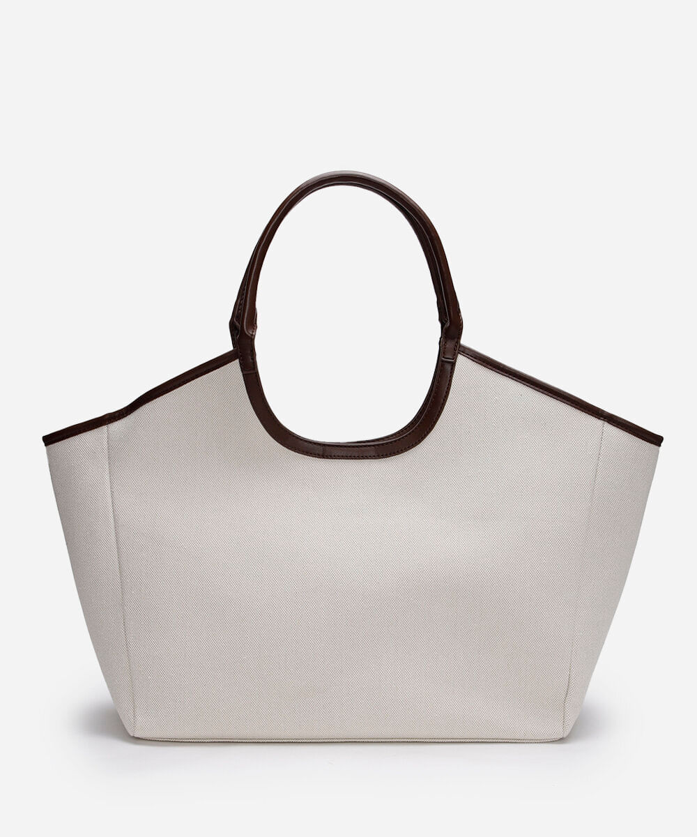 Bolsa shopper desenvolvida em lona . O modelo tem formato retangular, com forro em tecido plano, alças de ombro e fechamento por botão magnético.