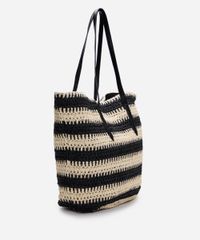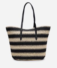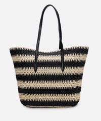 Bolsa shopper desenvolvida em material sintético com aspecto e textura de palha. O modelo tem formato retangular com alças fixas de ombros, forro em tecido plano, bolso interno e fechamento por botão magnético.