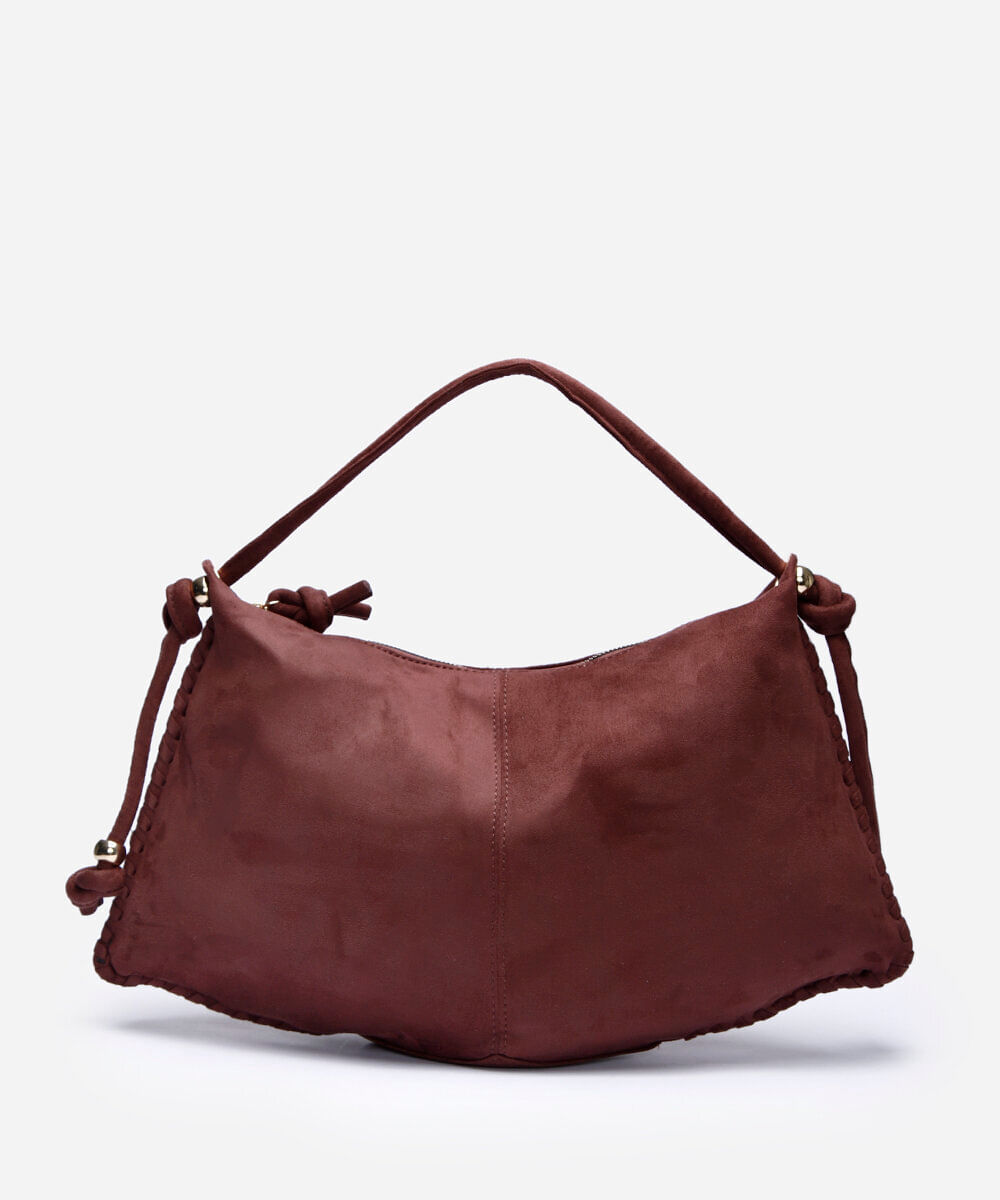 Bolsa shoulder desenvolvida em material sintético com textura de camurça. O modelo tem formato retangular, com recorte losangular na base e alça de ombro com miçangas metálicas. Possui forro e bolso interno com fechamento por zíper.