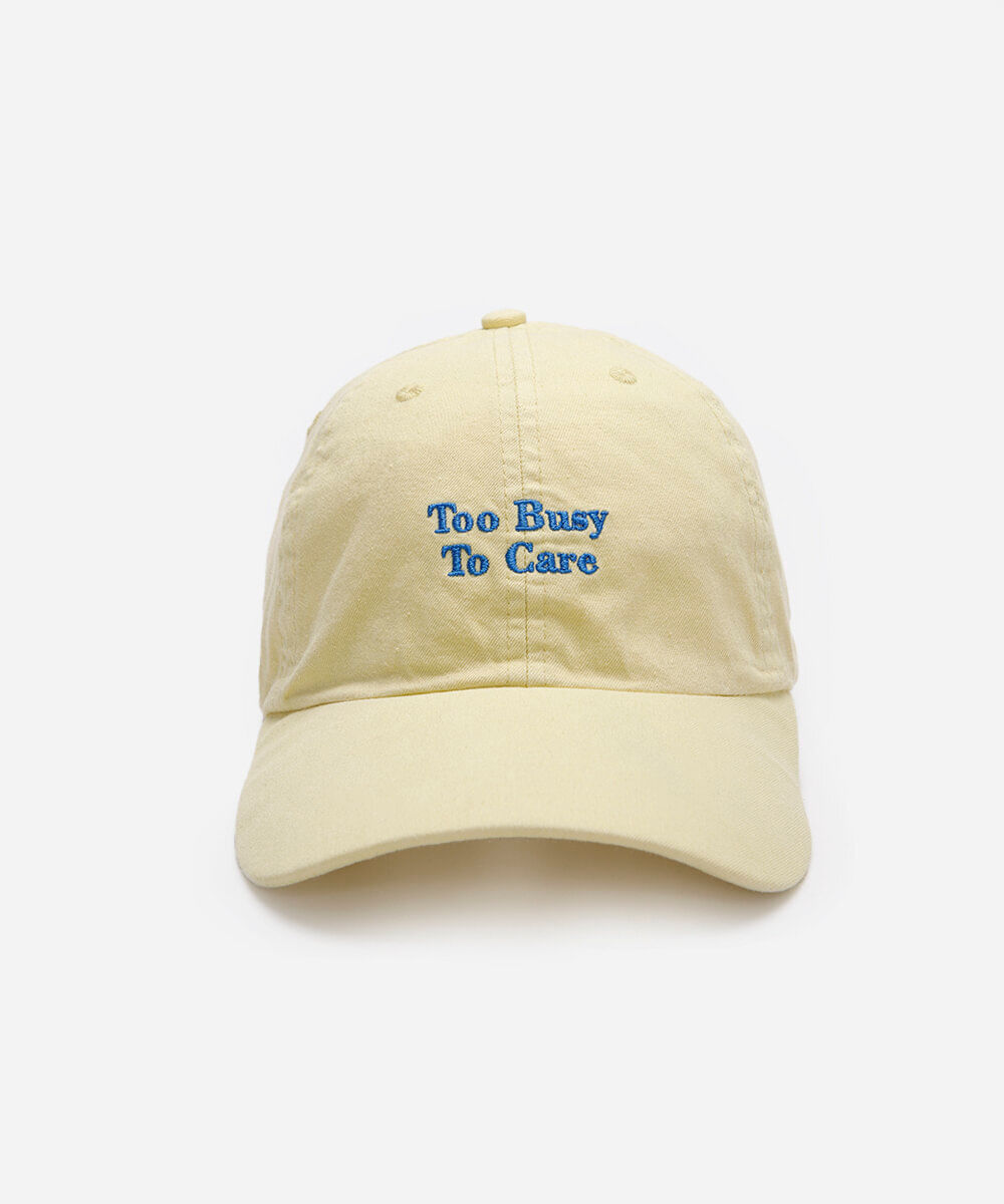 Boné confeccionado em sarja estonada com bordado contrastante escrtio "tooo busy to care". O modelo é aba curva, com caimento ajustado, recortes pespontado e ajuste por fivela posterior.