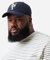 Boné confeccionado em sarja com bordado escrito "NY". O modelo é aba curva, com caimento ajustado, recortes pespontados e ajuste por fivela posterior.