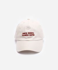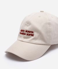 Boné confeccionado em sarja com bordado localizado escrito "gente bonita também sofre". O modelo é aba curva, com caimento ajustado, recortes pespontados e fivela posterior para ajuste.