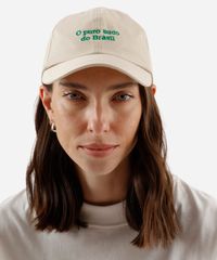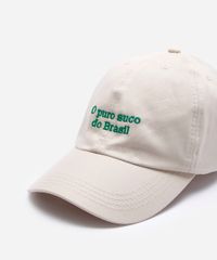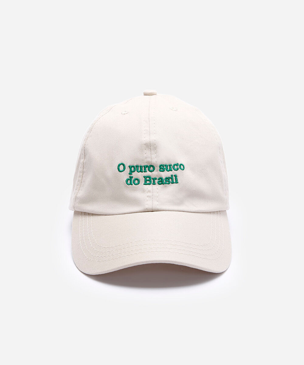 Boné confeccionado em sarja com bordado localizado escrito "o puro suco do Brasil". O modelo é aba curva, com caimento ajustado, recortes pespontados e fivela posterior para ajuste.