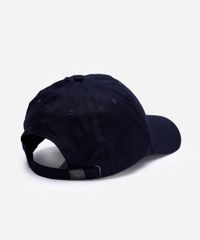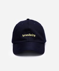 Boné confeccionado em sarja de algodão com bordado localizado escrito "brasileira". O modelo é aba curva, com caimento ajustado, recortes pespontados e ajuste por fivela posterior.