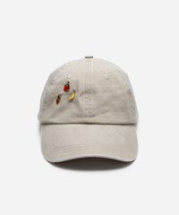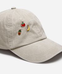 Boné confeccionado em sarja com aplicação pingentes de frutas. O modelo é aba curva, com caimento ajustado, recortes pespontados e fivela posterior ajustável.
