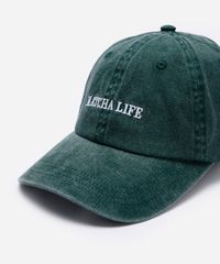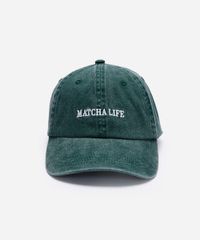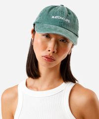 Boné feminino confeccionado em sarja com efeito estonado. A peça possui aba curva, recortes laterais, bordado frontal com escrita "matcha life" em cor contrastante, acabamento pespontado e fechamento posterior por strapback.