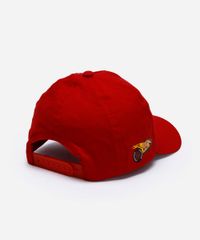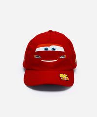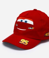 Boné infantil confeccionado em sarja. A peça possui aba curva, recortes laterais, estampas com desenhos do personagem McQueen de Carros em cores contrastantes, acabamento pespontado e fechamento posterior por snapback.