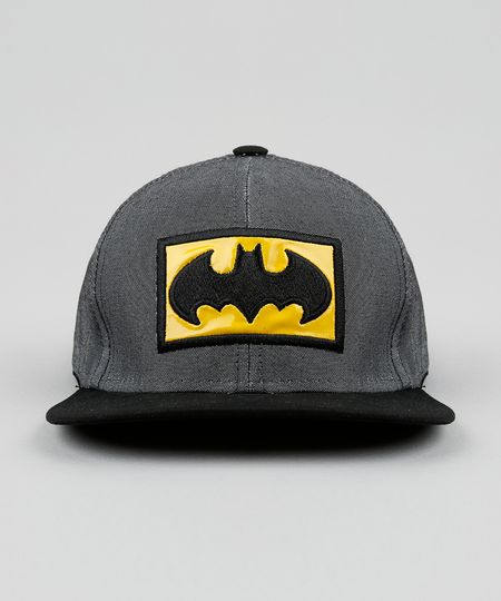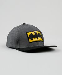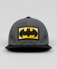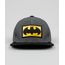 Boné infantil confeccionado em tecido plano. O modelo possui bordado com tema do herói Batman. A aba é reta e o fechamento é feito por tira com níveis de ajuste.