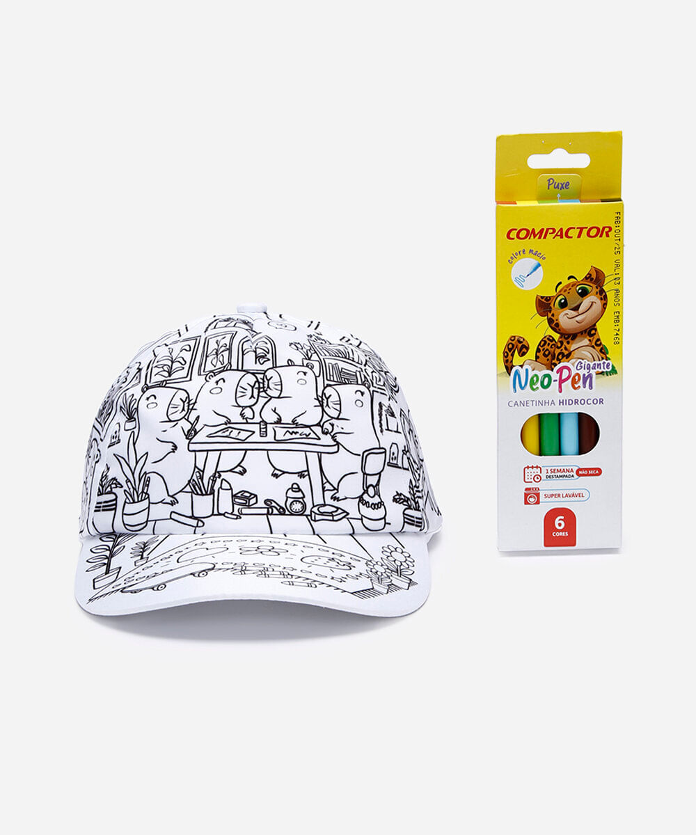 Boné infantil confeccionado em tecido leve com estampa temática de "Capivara". O modelo é aba curva, com caimento ajustado, recortes pespontados e fechamento ajustável. Acompanha kit de 6 canetinhas para colorir. Composição: 100% poliéster Instruções de lavagem: - Lavagem manual - Não alvejar - Não secar em secadora - Secar na vertical - Não passar - Não lavar à seco