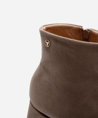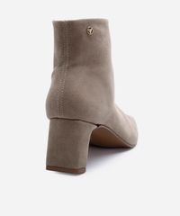 Bota feminina desenvolvida em material sintético resistente. O modelo tem bico fino e cano curto, cabedal liso e fechamento por zíper. Possui palmilha macia com inscrição de marca, salto grosso, baixo e sola texturizada que auxilia no caminhar.
