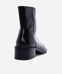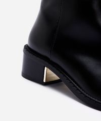 Bota feminina confeccionada em material sintético. O modelo tem bico redondo, cano curto, detalhe com costura central, salto bloco com detalhe metalizado, palmilha acolchoada, solado emborrachado e fechamento lateral com zíper.