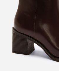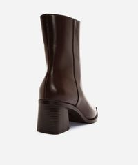 Bota feminina desenvolvida em material sintético resistente. O modelo tem bico fino e cano médio, cabedal liso e fechamento por zíper. Possui palmilha macia com inscrição de marca, salto grosso, baixo e sola texturizada que auxilia no caminhar.
