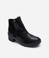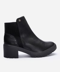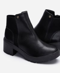 Bota confeccionada em material sintético com recortes laterais em elástico, apresentando um bico arredondado, cano curto com detalhe de pin metálico e sola tratorada com salto grosso médio.