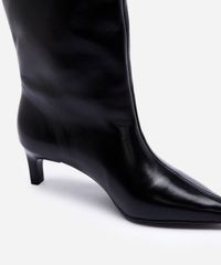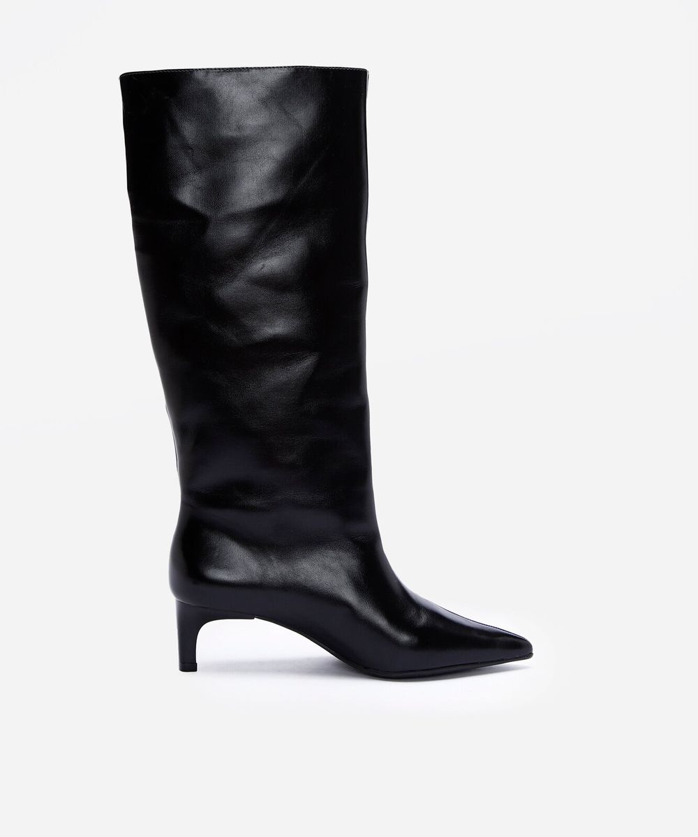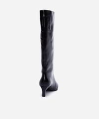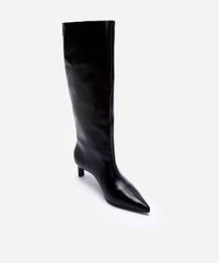 Bota feminina confeccionada em material sintético com efeito envernizado. O modelo tem bico fino, cano alto, recorte central, salto fino e solado emborrachado. Sem fechamento.