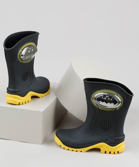 Bota infantil masculina desenvolvida em material sintético emborrachado. Tem estampa e detalhe em relevo do personagem Batman, da DC Comics. O modelo tem cano médio com bico arredondado. A sola tem textura antiderrapante.