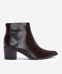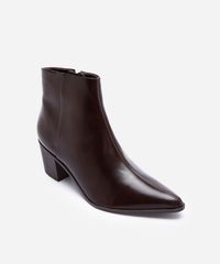 Bota feminina desenvolvida em material sintético resistente. O modelo western tem bico fino e cano curto, cabedal liso e fechamento por zíper. Possui palmilha macia com inscrição de marca, salto grosso, baixo e sola texturizada que auxilia no caminhar.