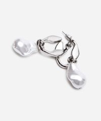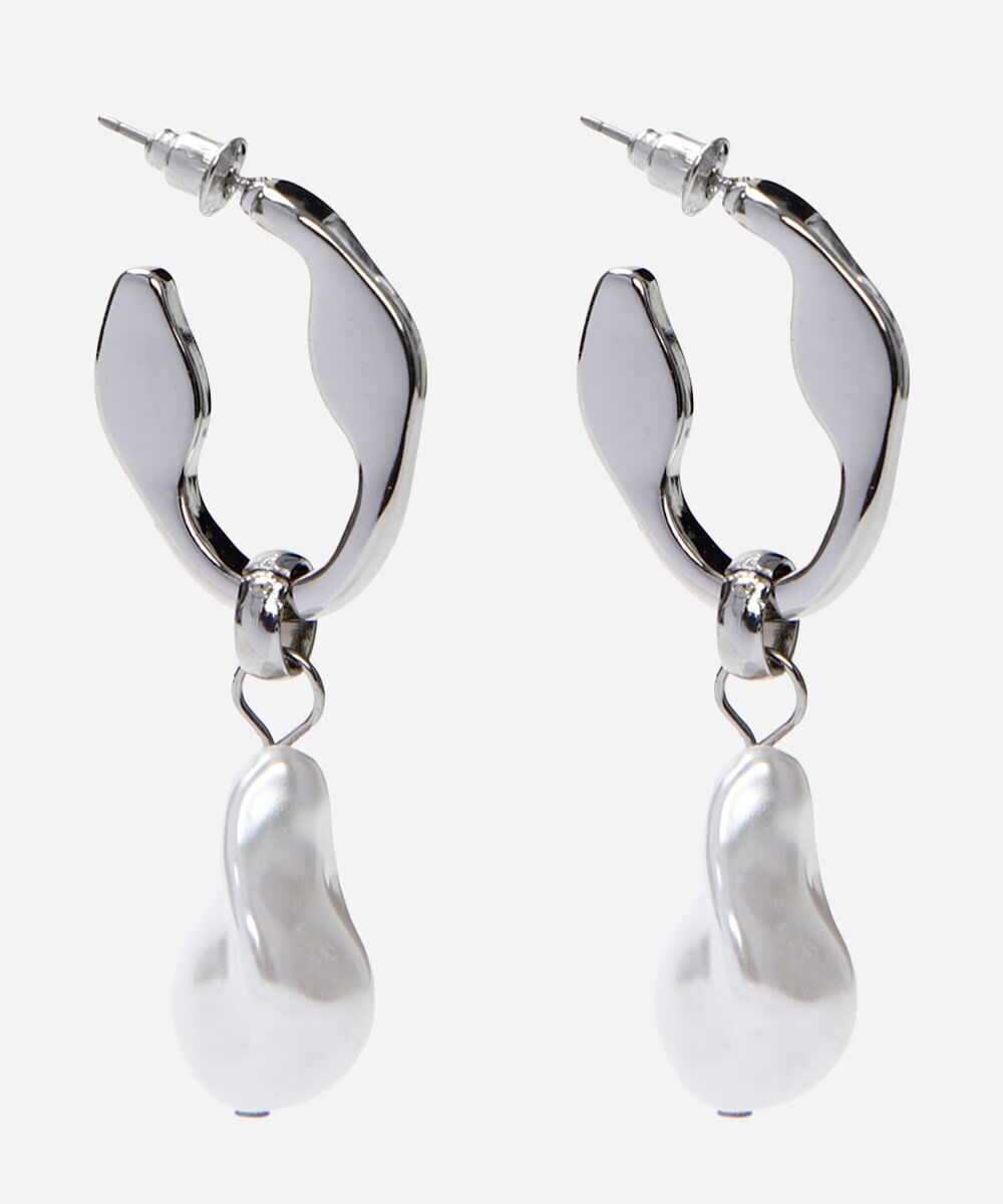 Par de brincos desenvolvido em metal resistente. O modelo é argola com ondulações e pingente de pérola artificial em forma orgânica. Possui fechamento tarraxa. Este é um acessório hipoalérgico livre de níquel.