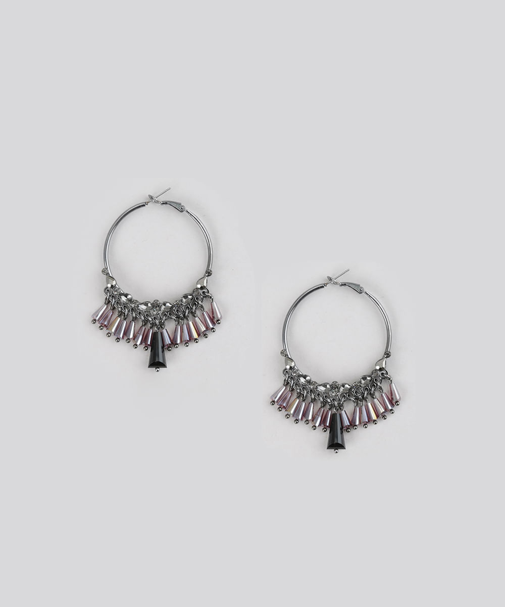 Brinco desenvolvido em metal. O modelo com formato de argola tem detalhe de strass e missangas. O fechamento é por encaixe.