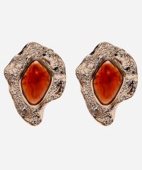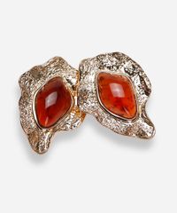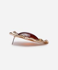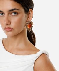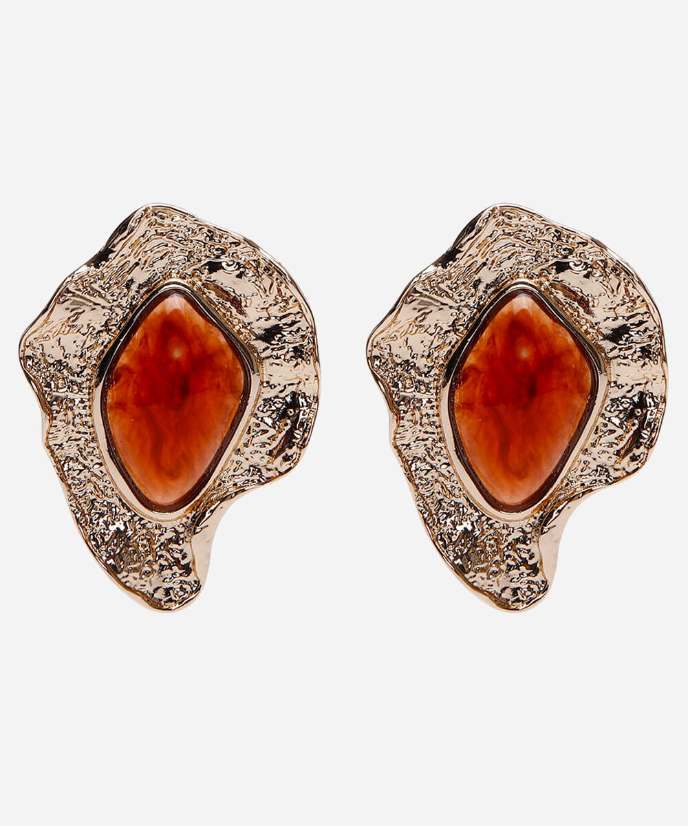 Par de brincos desenvolvido em metal resistente com banho dourado e resina. O modelo tem formato orgânico texturizado com aplicação de pingente em resina e fechamento por tarraxa. Este é um acessório hipoalérgico livre de níquel. Evite contato com água, cosméticos e produtos químicos. Atritos também podem danificar o banho das peças e ao guardar separe as douradas das prateadas.