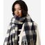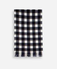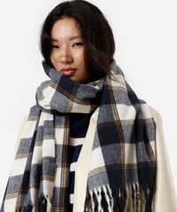 Cachecol confeccionado em tecido plano com viscose e padronagem xadrez. O modelo tem formato retangular e acabamento com franjas nas extremidades.