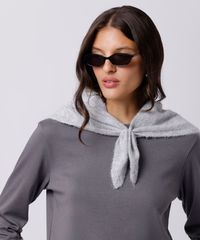 Cachecol confeccionado em tricot com textura felpada. O modelo tem formato triangular e acabamento canelado nas extremidades.