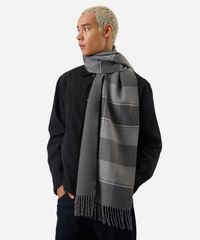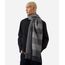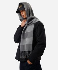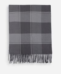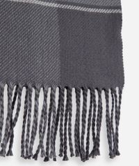 Cachecol confeccionado em tecido plano com padronagem xadrez. O modelo tem formato retangular e acabamento com franjas nas extremidades.