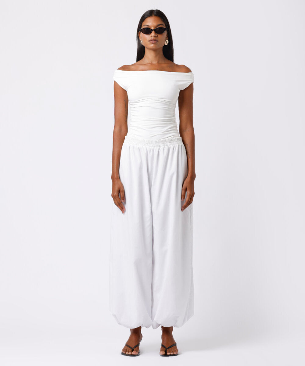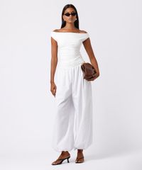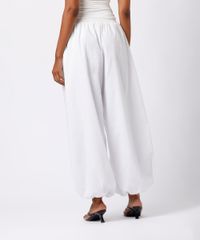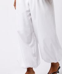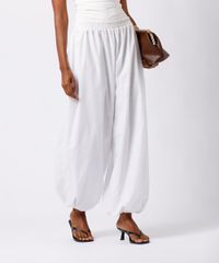 Calça feminina confeccionada em tecido plano. A peça tem a modelagem aladim, com construção afunilada, caimento amplo e confortavelmente solto ao corpo. O modelo tem cintura alta e cós com elástico embutido. Possui forro em malha e acabamento com elástico embutido nas barras.