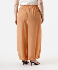 Calça feminina confeccionada em tecido plano de viscose e poliamida. A peça tem modelagem aladim, com construção afunilada e caimento solto ao corpo. O modelo tem cintura alta, cós com elástico embutido e forro. Detalhe de acabamento com elástico embutido nas barras.