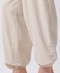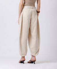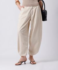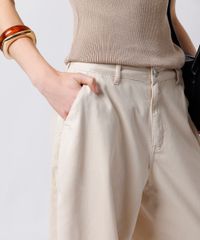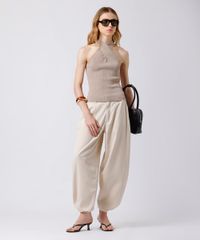 Calça feminina confeccionada em sarja. A peça tem a modelagem aladim, com construção reta, caimento é confortavelmente solto ao corpo e barras volumosas com elásticos embutidos. O modelo tem cintura alta, cós com passantes para cinto e fechamento por botão e zíper. Possui dois bolsos na parte frontal e um embutido na parte posterior.