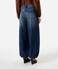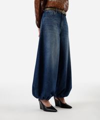 Calça feminina confeccionada em jeans. A peça tem a modelagem aladim, com construção ampla, caimento solto ao corpo e barras volumosas com elástico embutido. O modelo tem cintura média, cós com passantes para cinto e fechamento por botão e zíper. Possui três bolsos na parte frontal e dois aplicados na parte posterior. Detalhe de acabamento em pesponto contrastante.