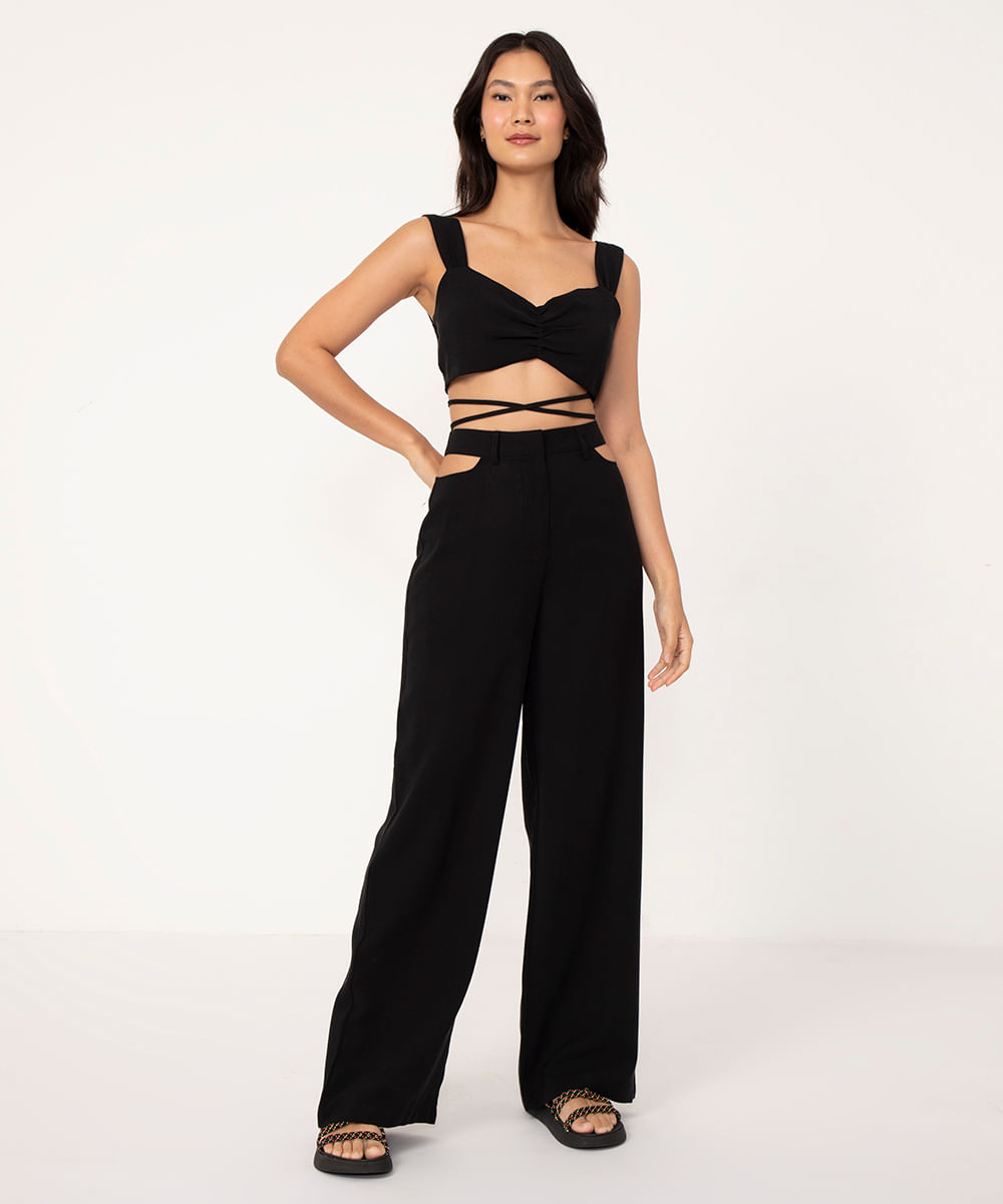 Esta calça feminina é super versátil. Para um look casual e moderno, combine-a com um top cropped para destacar os recortes na cintura e finalize com sandálias de plataforma ou rasteirinhas. Para uma proposta mais elegante, aposte em uma camisa por dentro da calça e um blazer feminino alongado, criando um visual sofisticado para o trabalho ou um evento especial. A peça transita facilmente entre o dia e a noite.